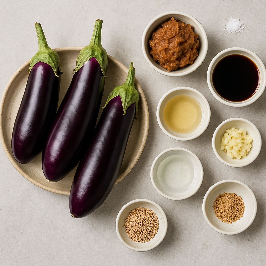 가지는 깨끗이 씻은 뒤 길게 반으로 자르고, 칼집을 사선으로 내어 양념이 잘 배도록 준비해 주세요. 팬에 구울 때 물컹하지 않고 식감이 살아있도록 소금에 10분 정도 절여 물기를 제거하는 것도 좋은 방법입니다. 소스는 된장, 간장, 맛술, 물, 다진 마늘을 한데 섞어 미리 준비해 둡니다.