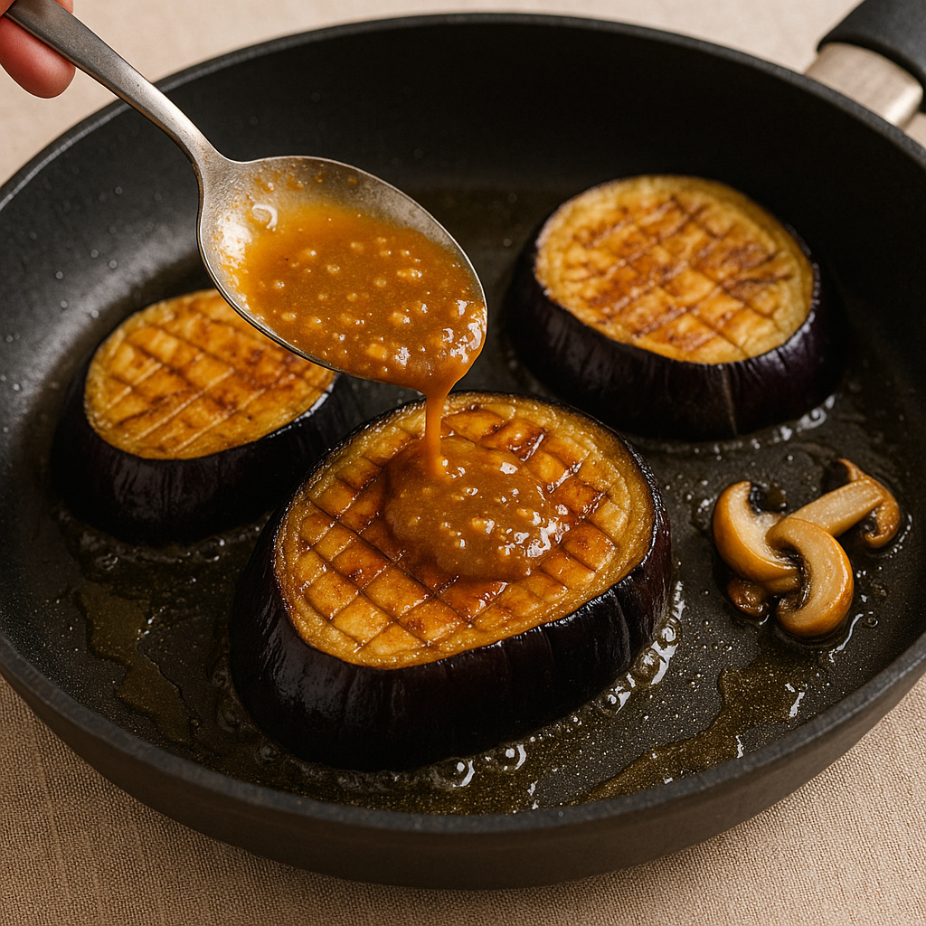 - 된장소스는 졸이듯 끓여야 감칠맛이 응축되어 고기 없이도 깊은 풍미를 줍니다.