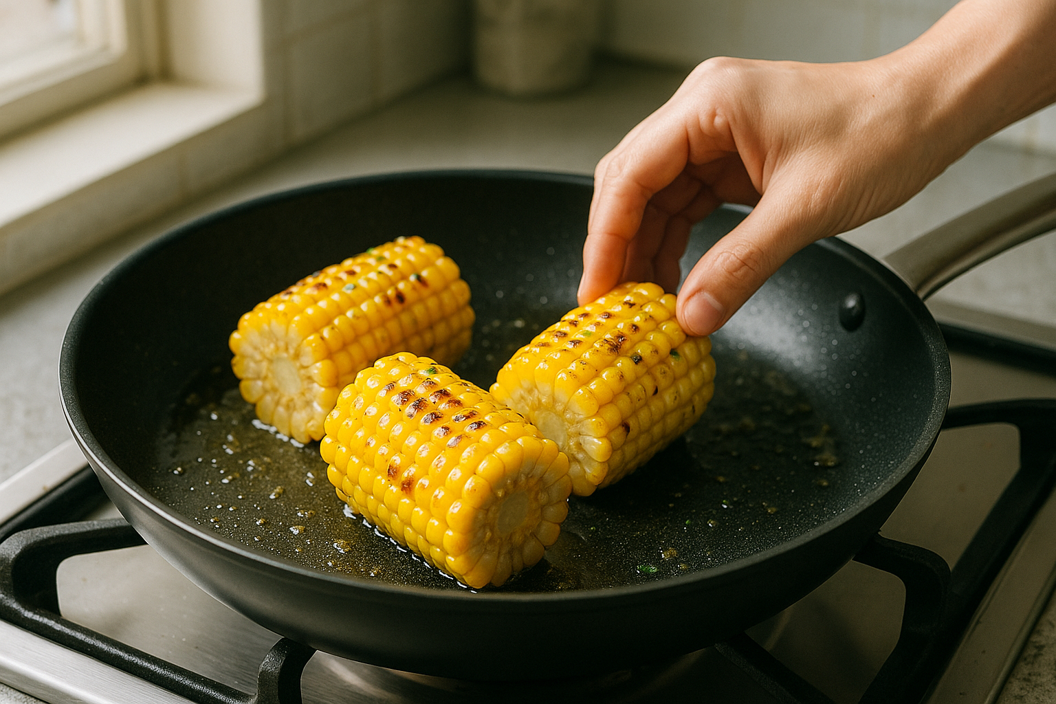- 옥수수를 팬에 올려 8~10분간 노릇하게 굽습니다. 중간중간 돌려가며 골고루 익혀 주세요.