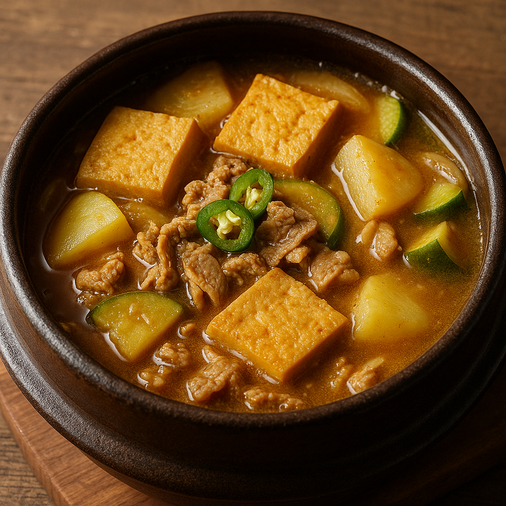냄비에 밑간 한 고기를 먼저 볶아 향을 내고, 고기가 반쯤 익으면 된장을 풀고 감자, 양파를 넣습니다. 쌀뜨물이나 물을 부은 뒤 끓이다가 감자가 반쯤 익으면 애호박, 두부를 넣고 중불로 10분간 더 끓입니다. 국간장과 고춧가루로 간을 맞추고 마지막에 청양고추를 넣어 마무리하세요.