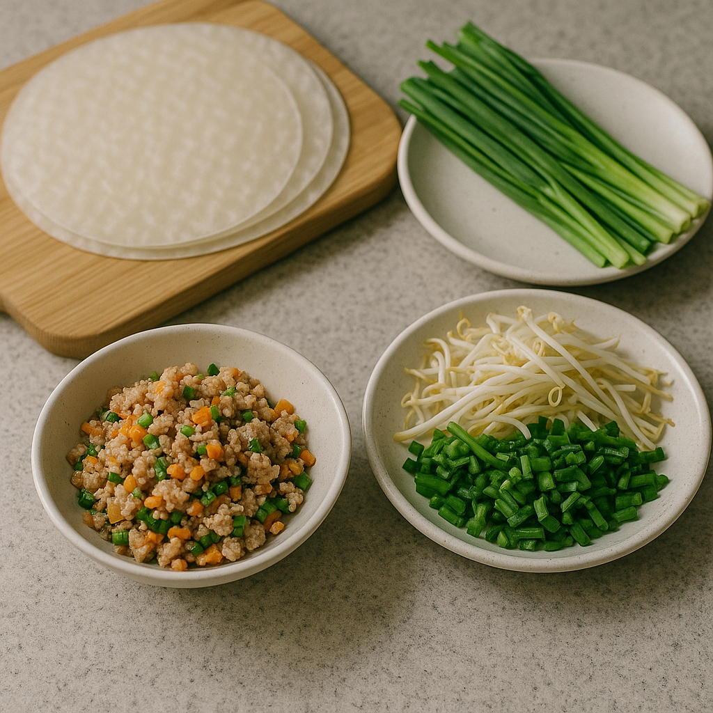 - 속재료 수분은 최대한 제거: 숙주는 꼭 데친 뒤 짜줘야 만두 안에서 물이 안 생겨요. 수분이 많으면 라이스페이퍼가 터질 수 있어요.