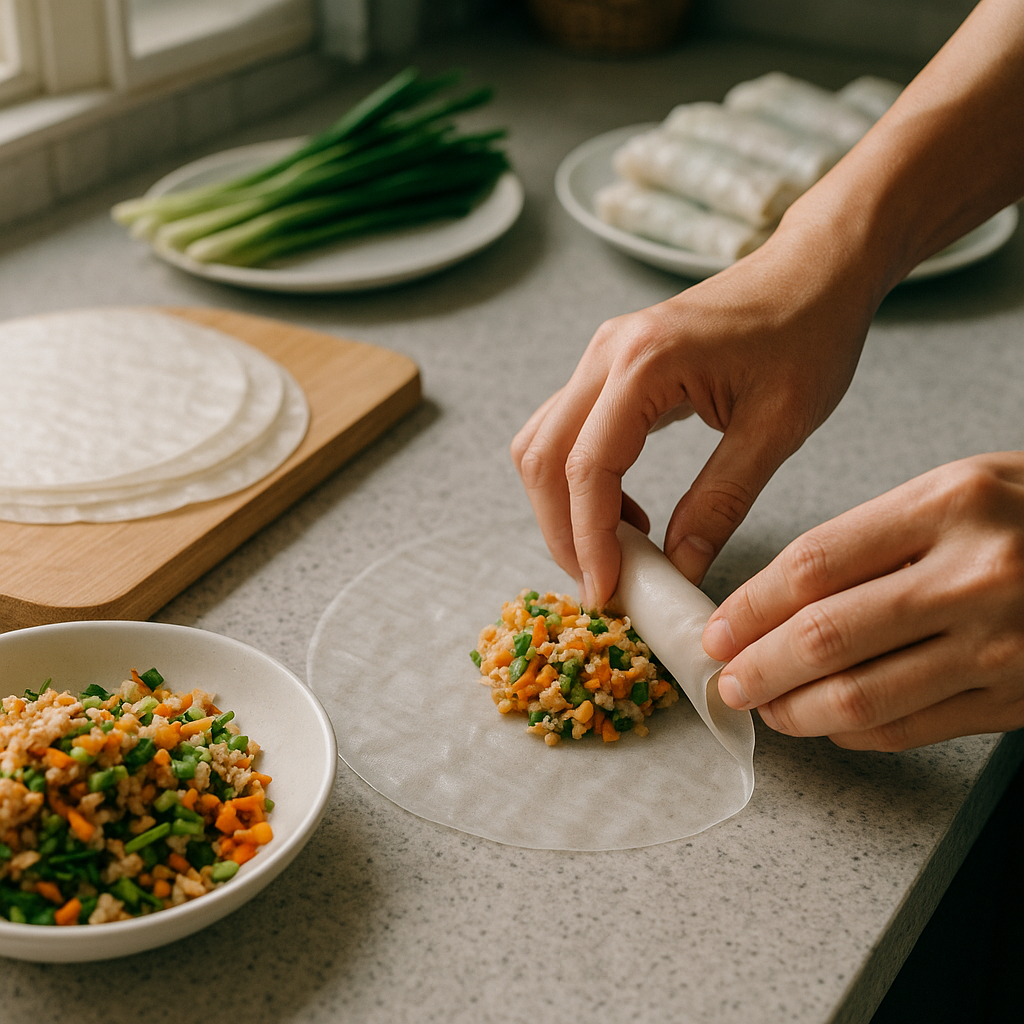 - 만두 모양으로 싸기 (7~10분): 적신 라이스페이퍼를 도마 위에 펼치고, 속재료를 한 스푼 얹은 뒤 사각형 또는 반달 모양으로 접어요. 끝부분은 잘 눌러 붙여줘야 구울 때 터지지 않아요.