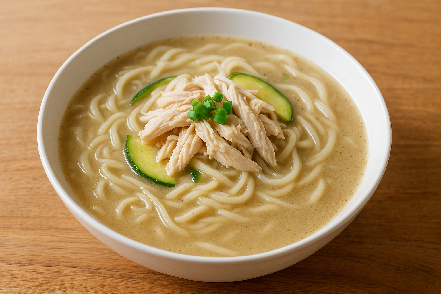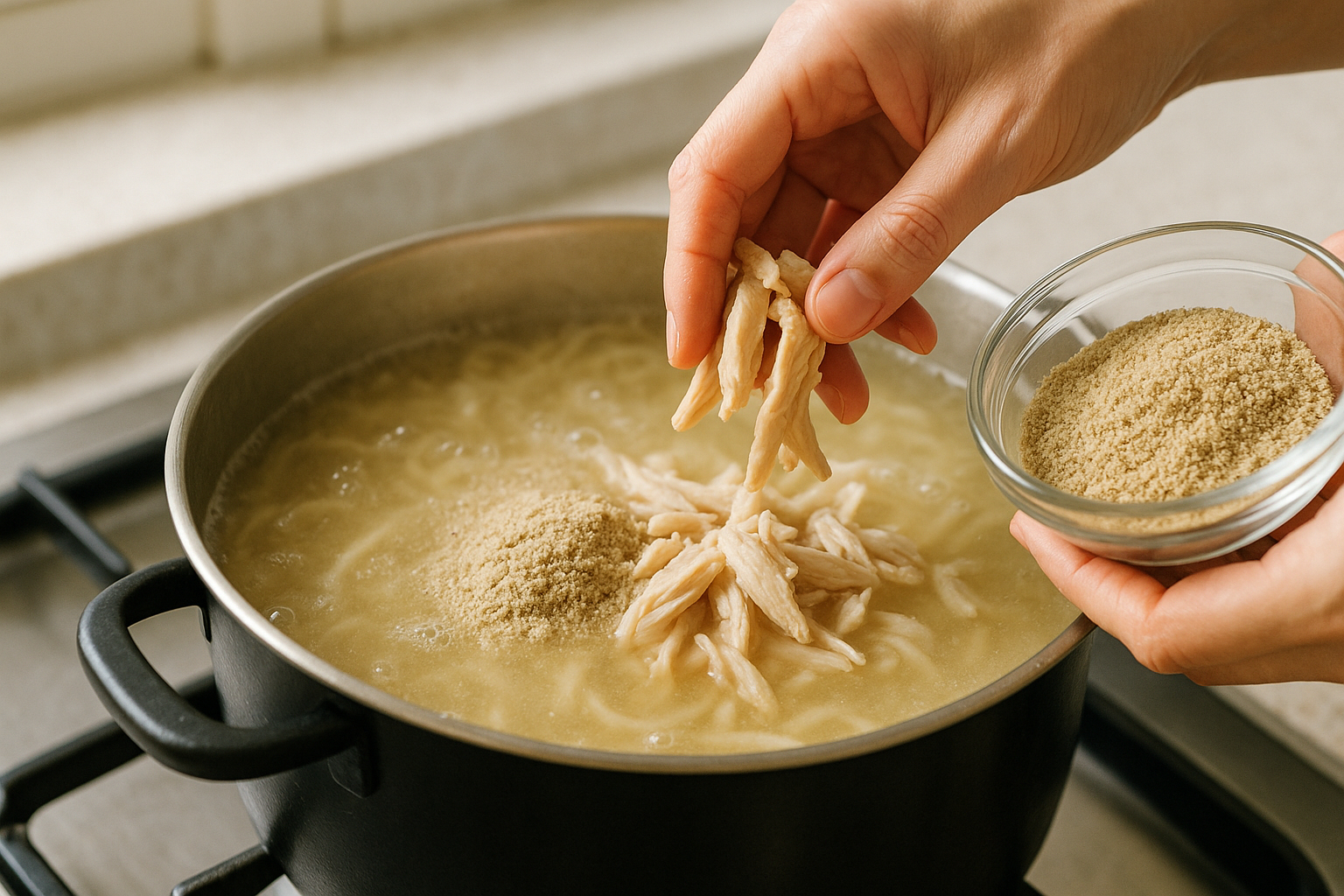 - 5. 면 삶기 (3분): 생칼국수면을 넣고 3분간 끓인 뒤, 찢은 닭고기를 넣고 1분 더 끓이면 완성입니다.