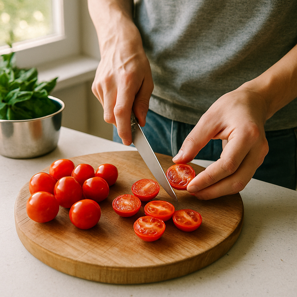 - 2. 마늘은 슬라이스로 썰고, 방울토마토는 반으로 자릅니다.