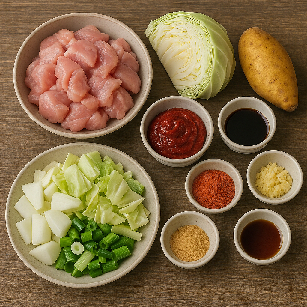 닭다리살은 한 입 크기로 자르고, 양념 재료를 모두 섞어 미리 양념장을 만들어주세요. 닭고기에 양념장을 넣고 30분 이상 재워둡니다. 양배추와 고구마, 양파는 굵직하게 썰고, 대파는 어슷썰기 해 준비합니다.